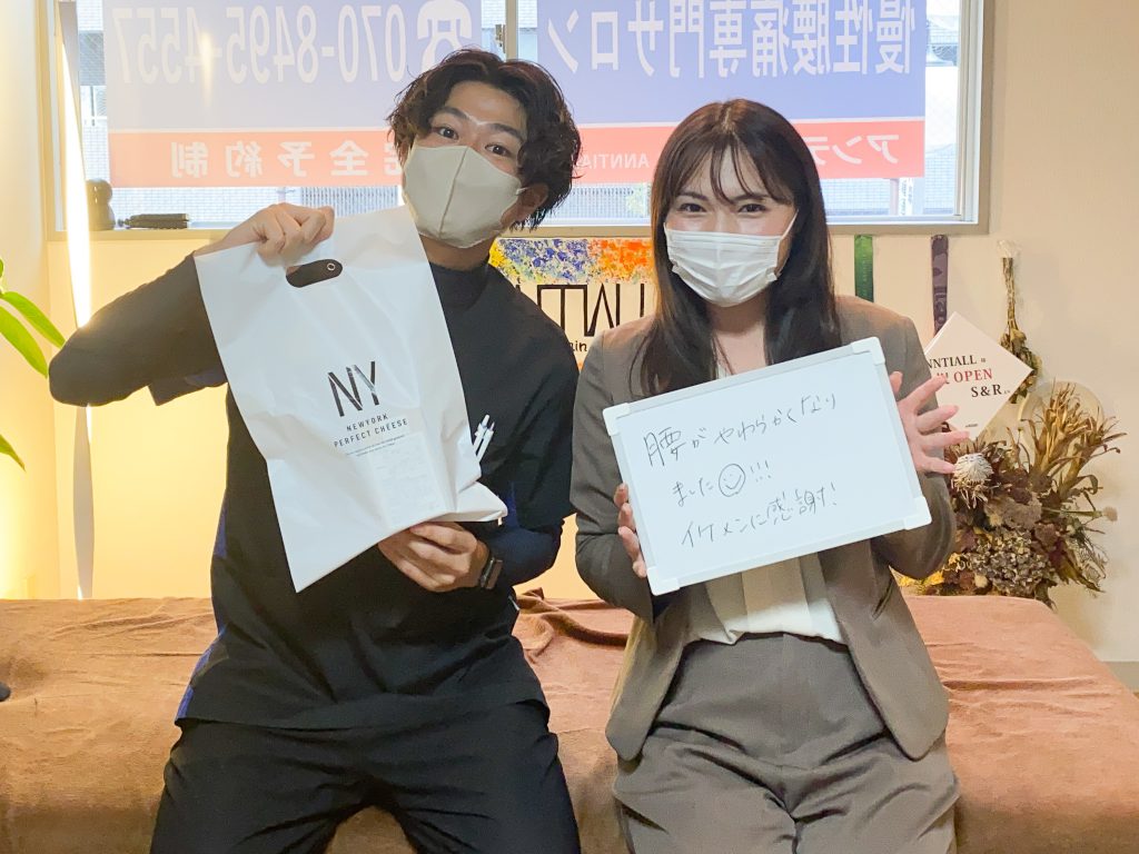 立ち仕事による腰痛が酷く転職まで考えていたのですが、小澤さんのおかげで辞めずに済みました! ただ施術するだけでなく、何が原因で痛いのかなど細かく説明してくれたおかげ施術が終わったあとも腰痛が出にくい生活を自分でも気をつけて送ることができるのですごく良かったです! 家で出来る腰痛改善のトレーニングやストレッチなども教えてくれるのでとてもありがたいですし、改善していくのが目に見えてわかるので腰痛で悩んでる方はぜひ小澤さんに! これからもお世話になります!! そしてすごく爽やかイケメンでした!笑