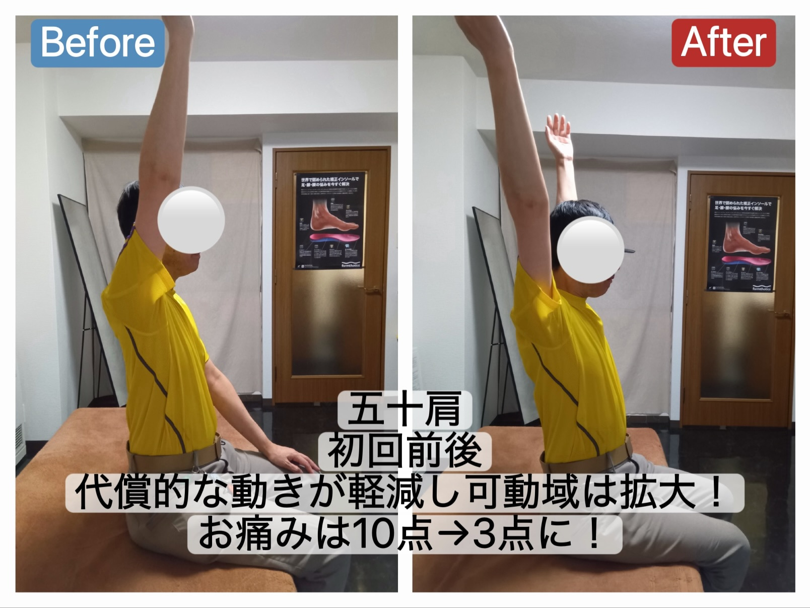 肩を庇った代償的な動きが軽減し、施術後可動域が拡大しました!