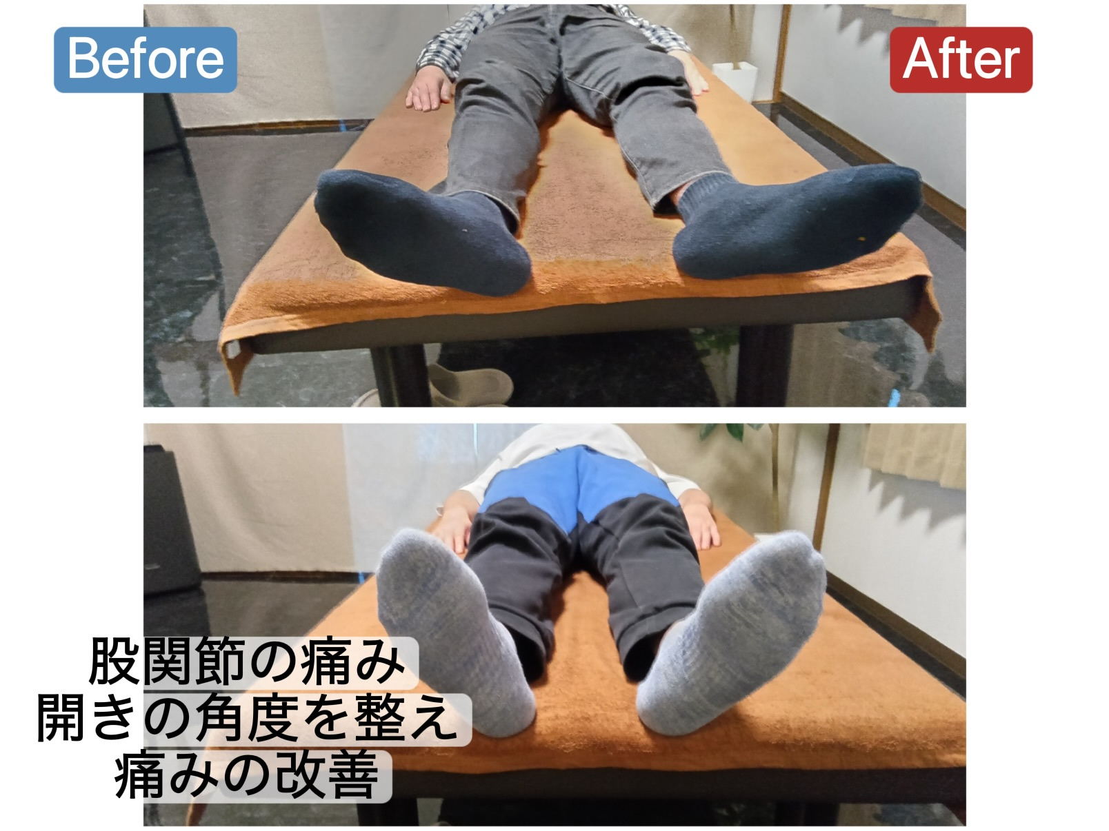上がBeforeです。股関節がかなり外側に開いてしまっている状態でした。
