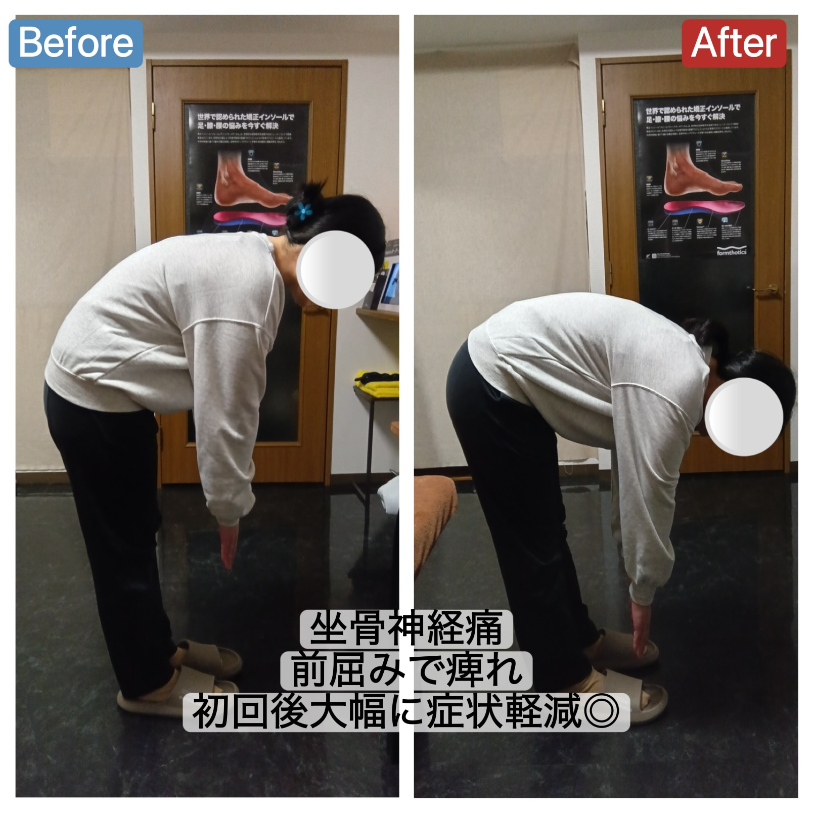 前屈みになると、お尻に痺れが出て前屈みができない状態でした。