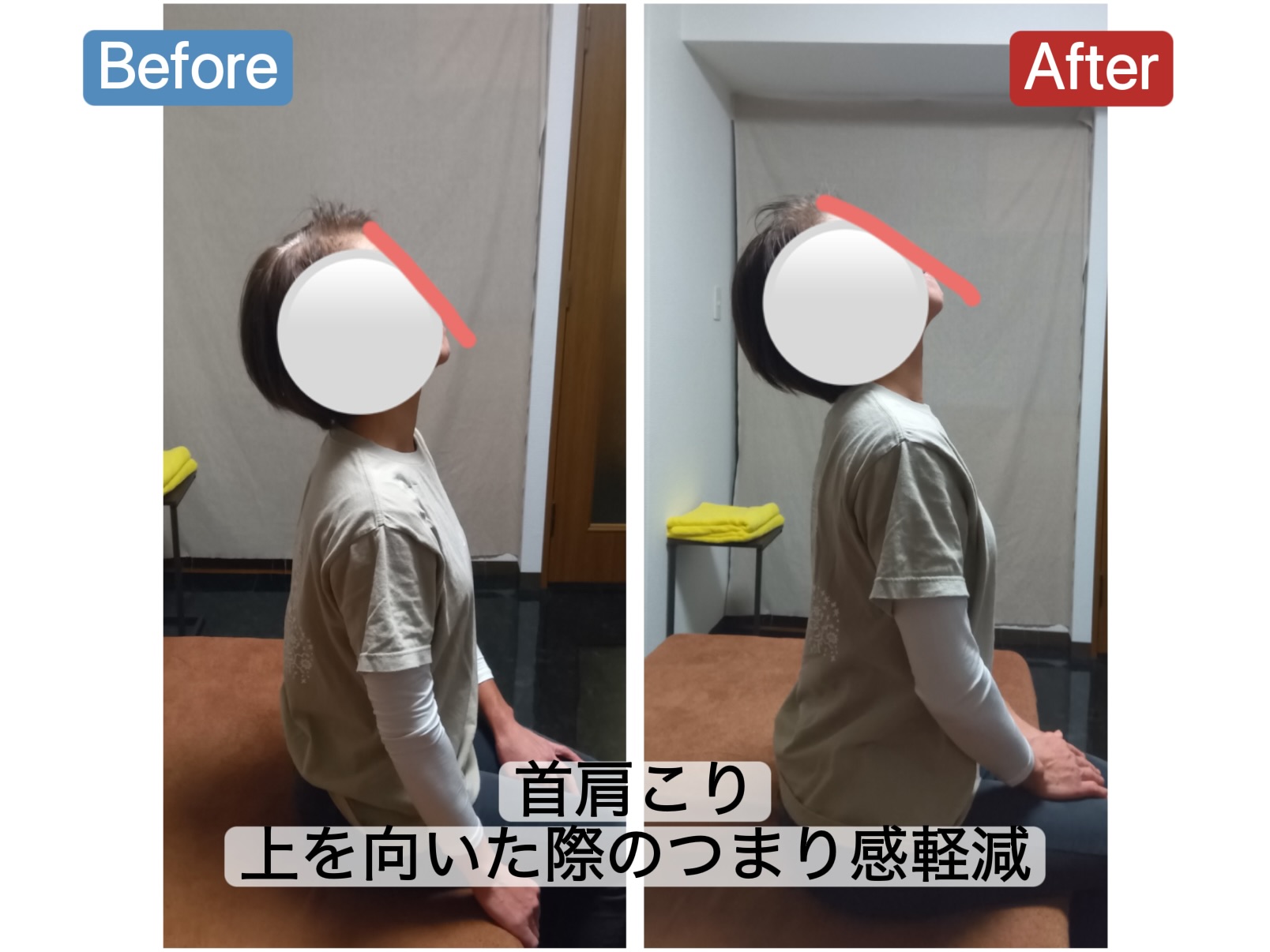 - 施術後は、上を向いたときの詰まり感が軽くなり、首の動きに変化が見られました。